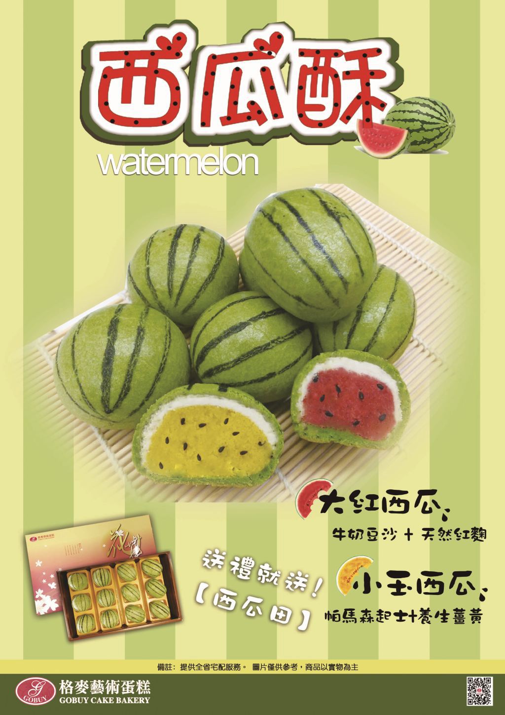 台灣特產的水果(西瓜、柚子、香蕉)為造型去製作,外皮使用天然的抹茶、竹炭和薑黃,西瓜內餡添加養生紅麴和黑芝麻,柚子加入充滿柚子香的果乾、香蕉選用有產銷履歷農產品標章(TAP)的香蕉製成內餡,個個充滿療癒的造型,清爽的口感,大人小孩都愛,絕對是送禮目光的焦點。